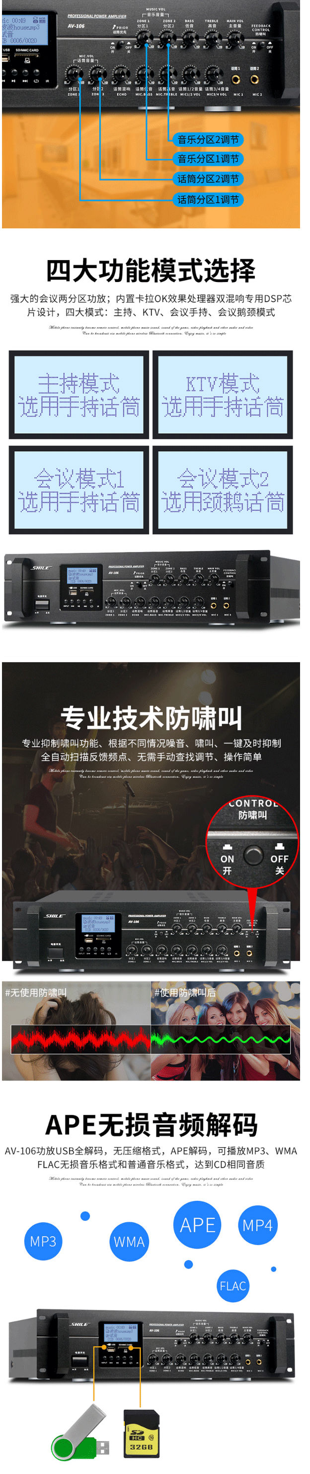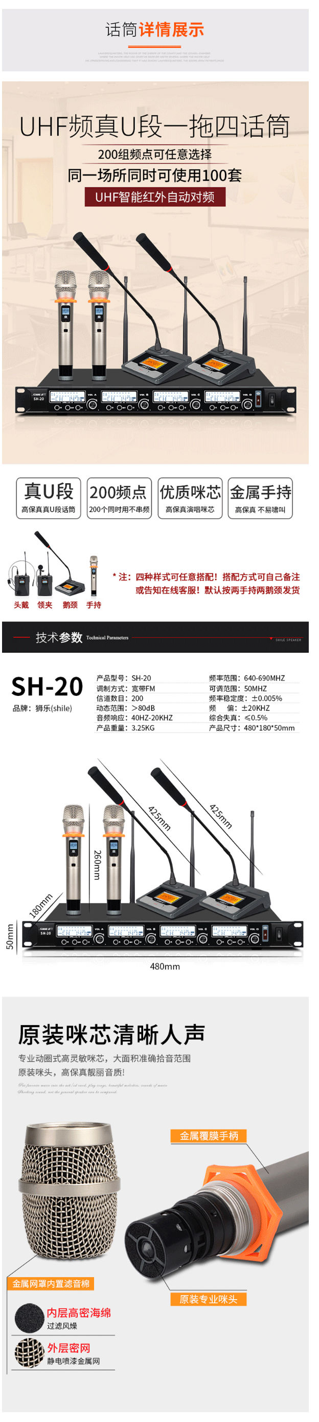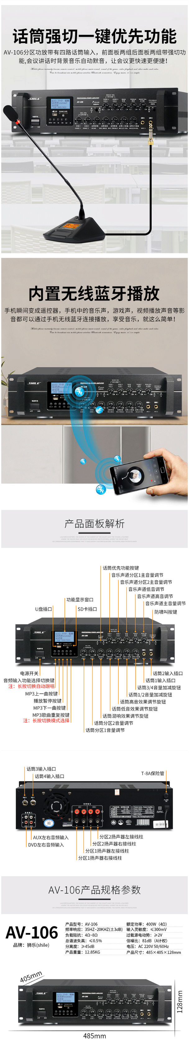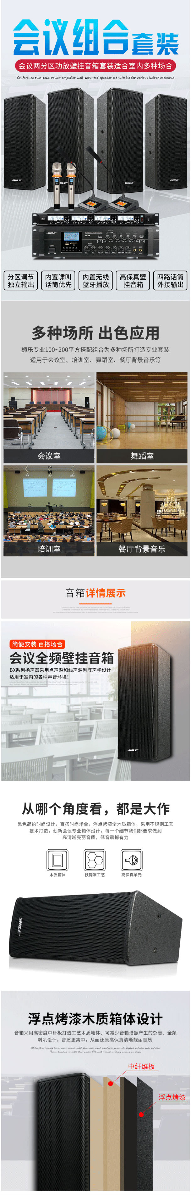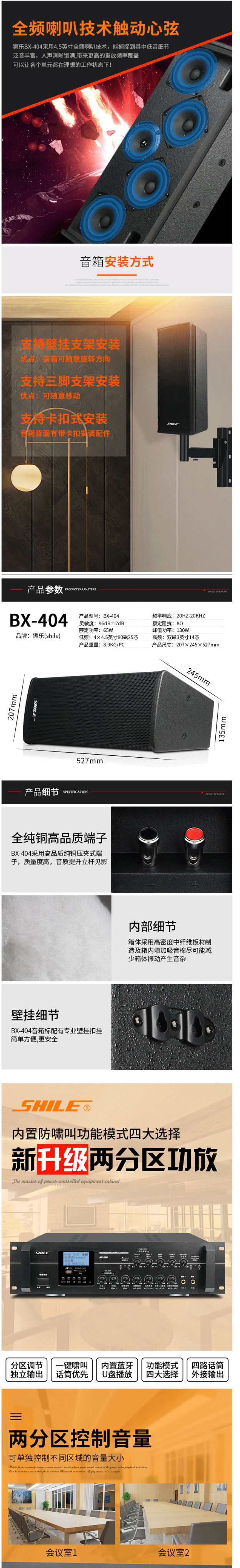 商品名称:狮乐(SHILE)AV106+BX404+SH20会议音响系统套装壁挂背景音乐分区控制4.5英寸音箱无线话筒高档会议音响