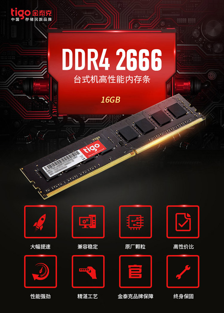 商品名称:金泰克(Tigo)DDR4 2666 16GB 台式机内存条