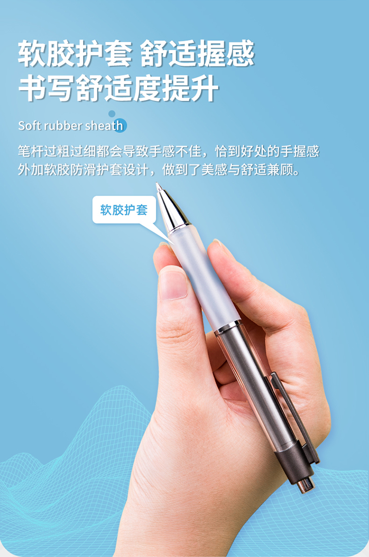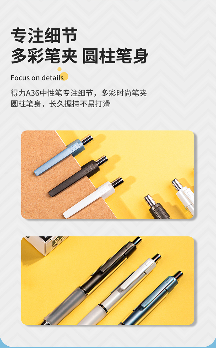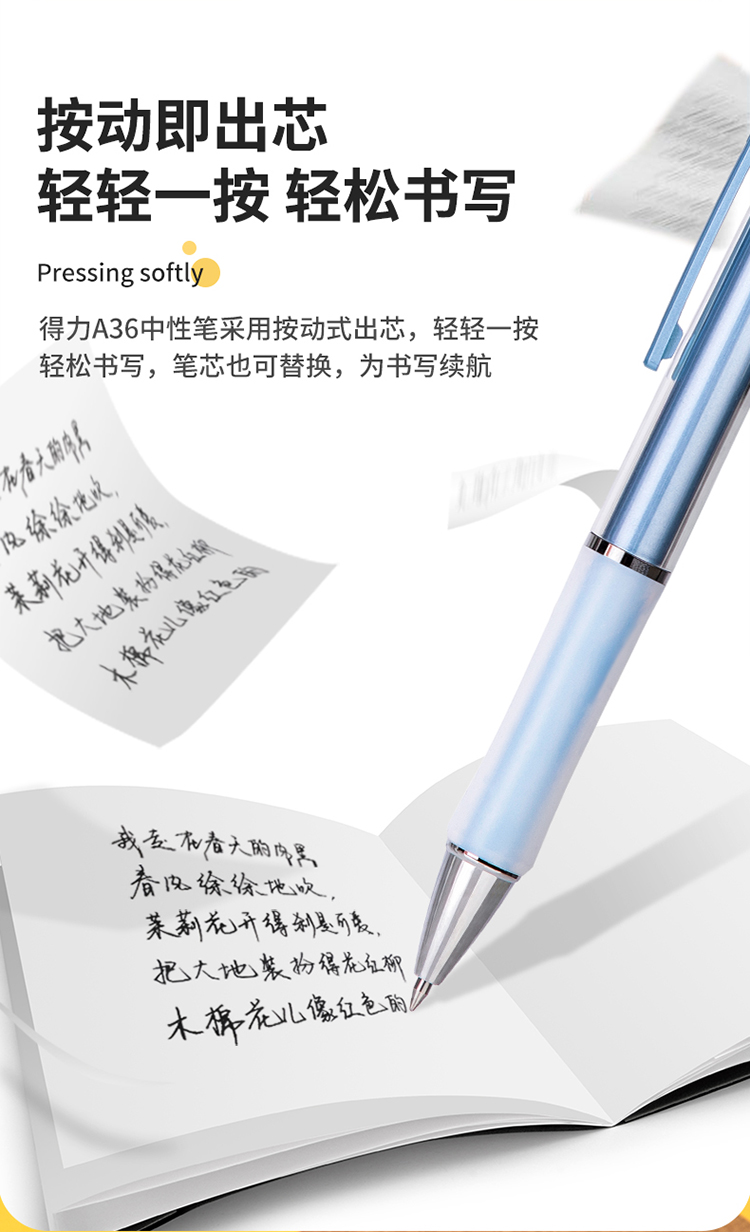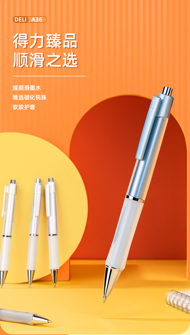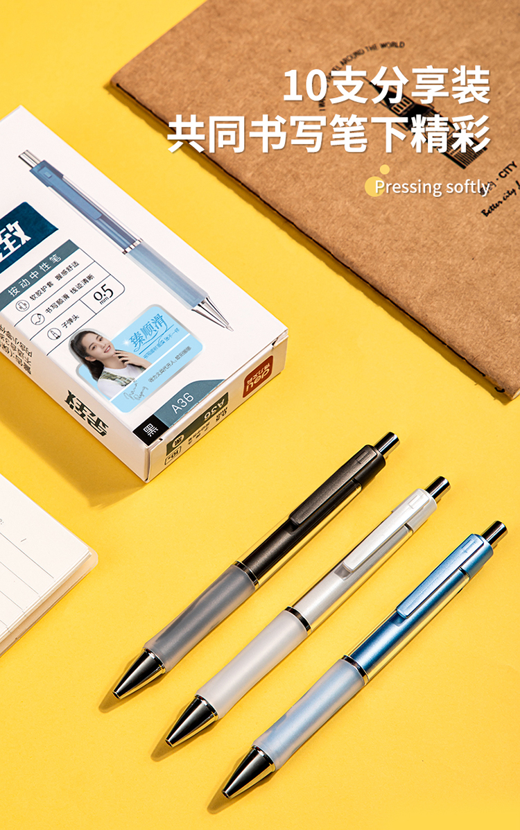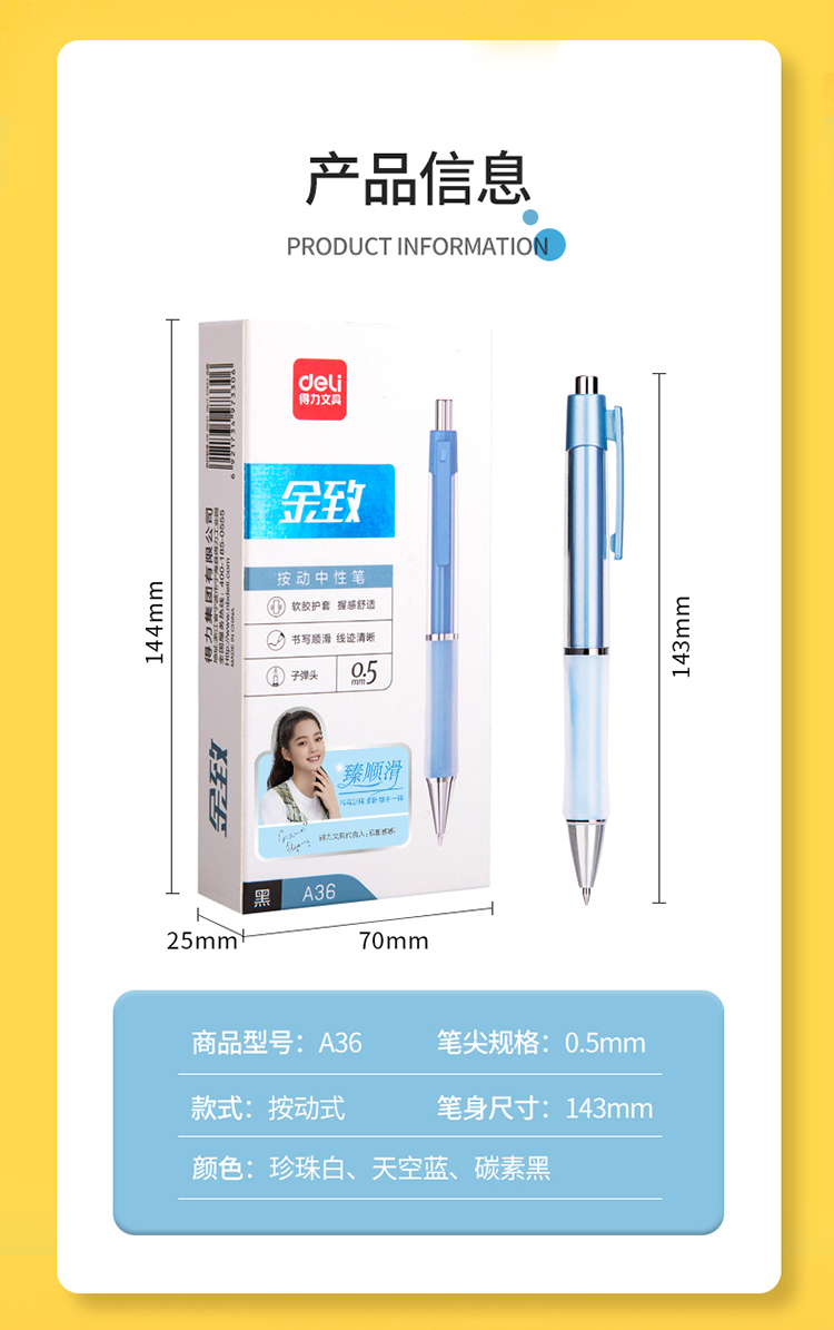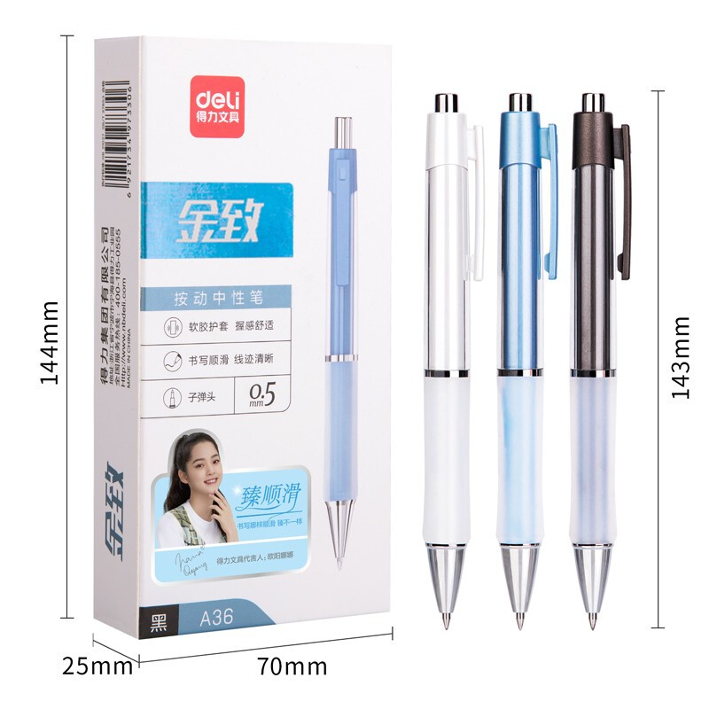 商品名称:得力(deli)DL-A36 乐素按动中性笔签字笔 0.5mm子弹头 舒适软胶款10支/盒