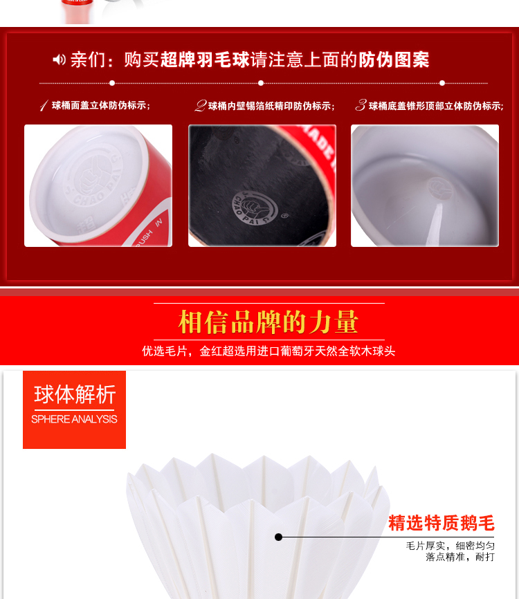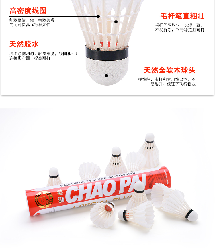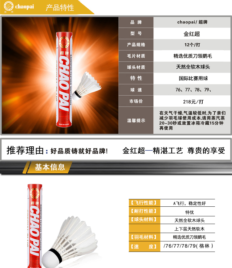 商品名称:超牌CHAOPAI金红超羽毛球比赛用球耐打飞行稳定12只一筒装全软木球头全圆鹅毛比赛球 金红超76速(1桶)