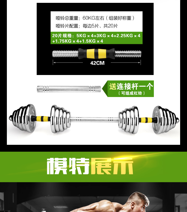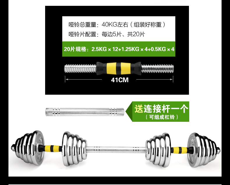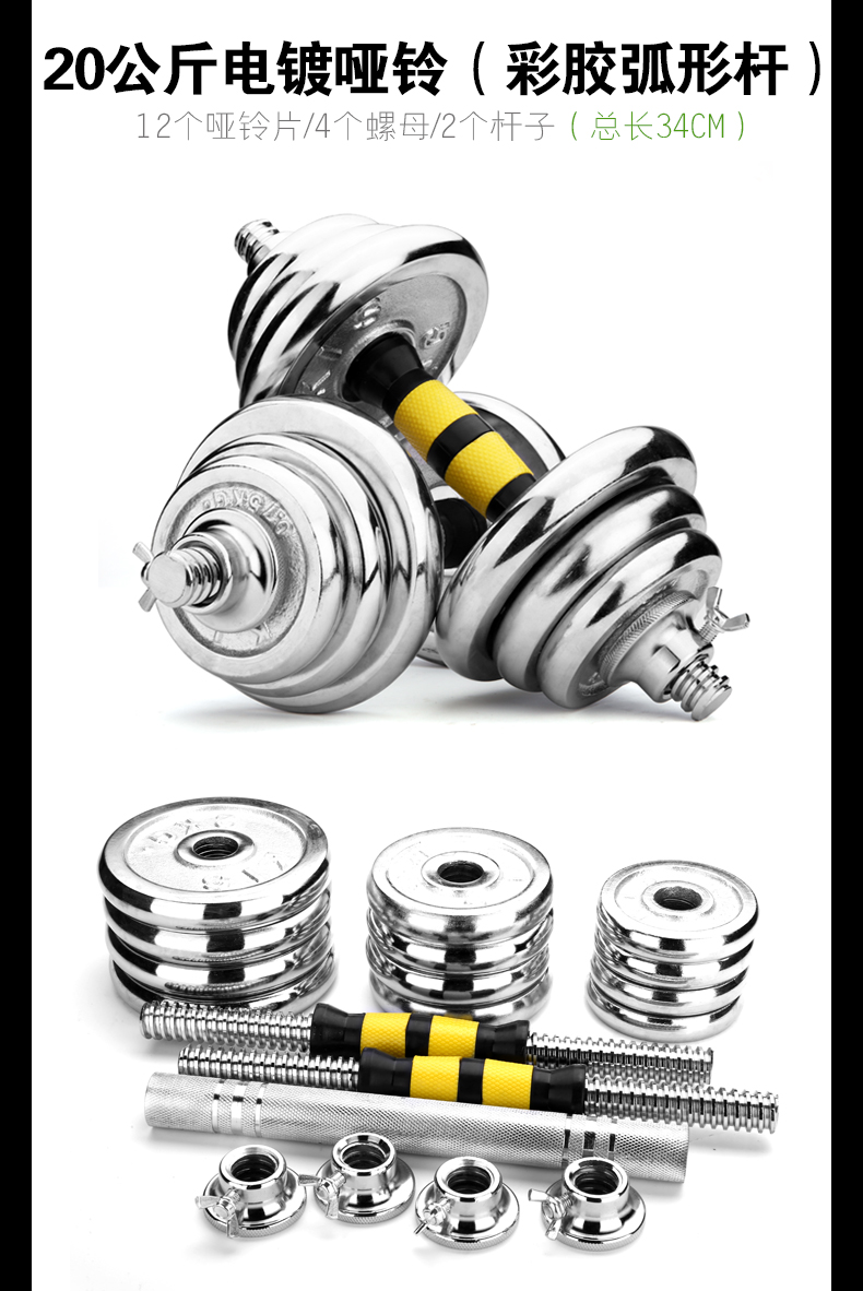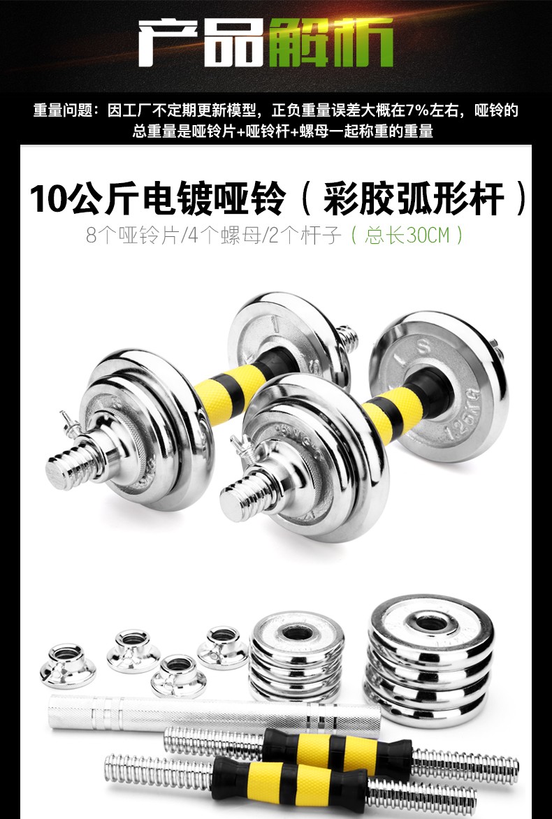 商品名称:华亚(HUAYA) 电镀哑铃男士杠铃套装组合家用运动健身器材 10kg一副(左右手各5公斤)+30公分连接杆