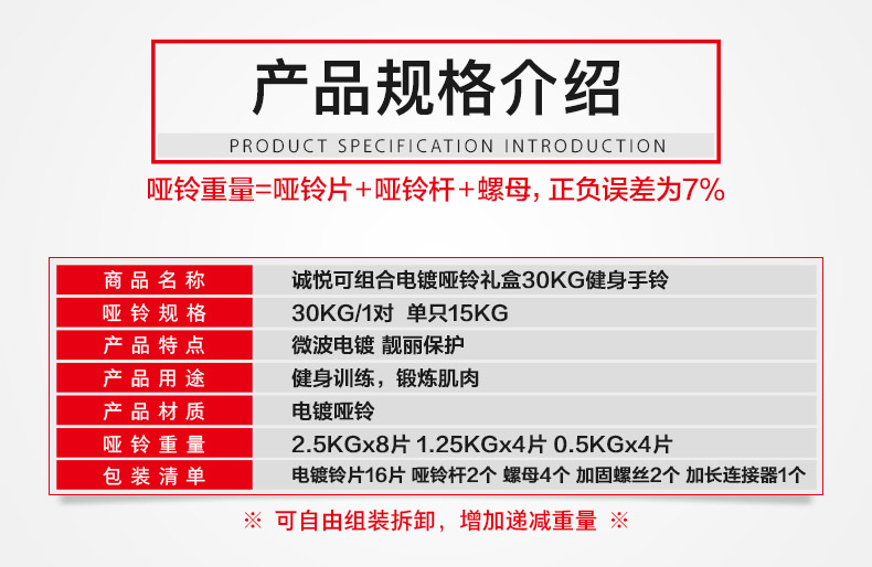 商品名称:诚悦电镀哑铃杠铃30kg(15kg*2)男女士运动健身训练器材家用组合套装升级款赠护手+护腕+30厘米连接器CY-160