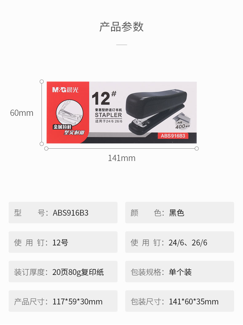 商品名称:晨光(M&G)文具12#黑色订书机 商务型省力订书器 普惠型办公用品(内附订书钉) 单个装ABS916B3