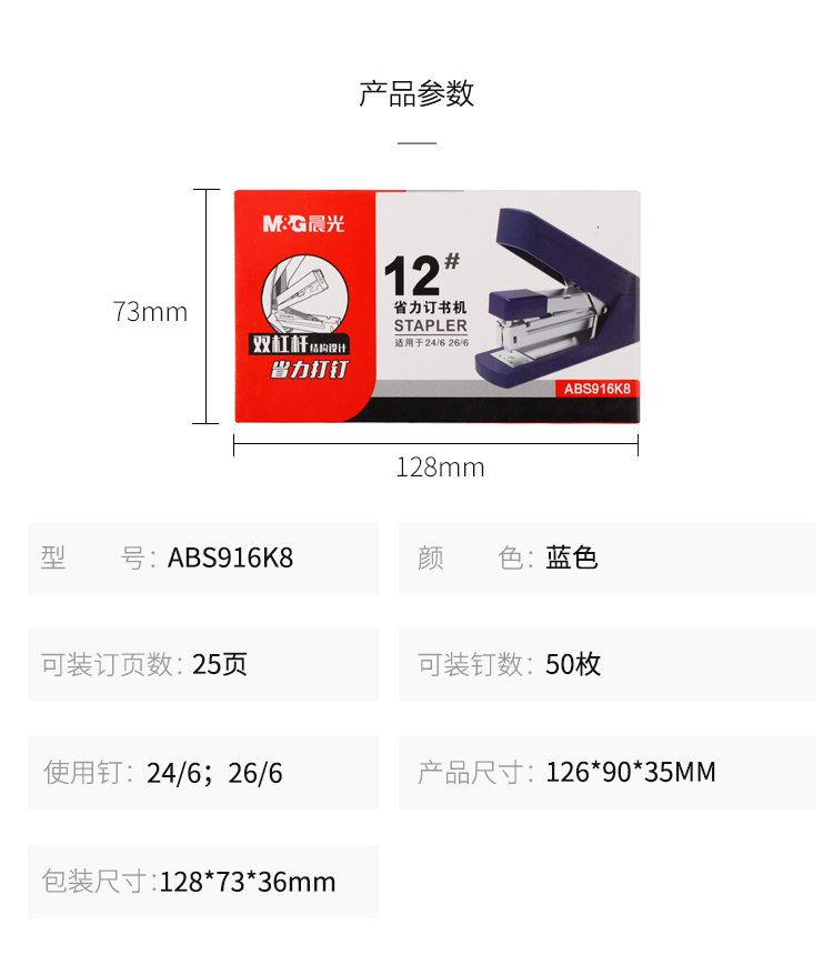 商品名称:晨光(M&G)文具蓝色订书机 商务型省力订书器 普惠型办公用品 单个装ABS916K8