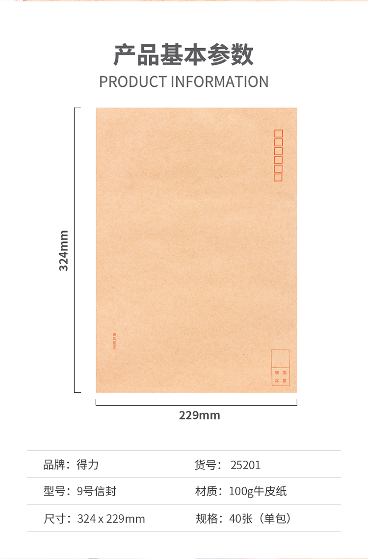 商品名称:得力(deli)40张9号A4牛皮纸大信封 邮局标准信封229*324mm 25201