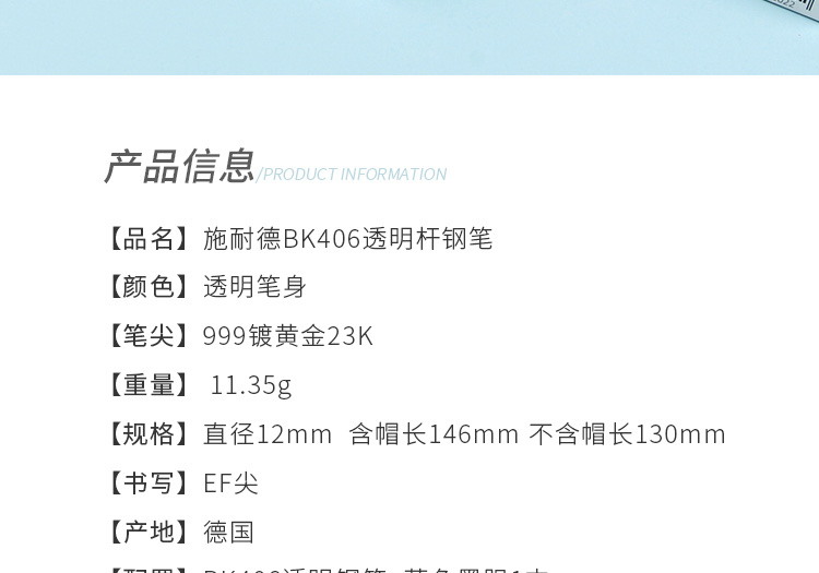 商品名称:德国施耐德(Schneider)钢笔23K镀金笔尖金夹签字笔男女学生用成人练字笔特细EF尖BK406透明笔杆