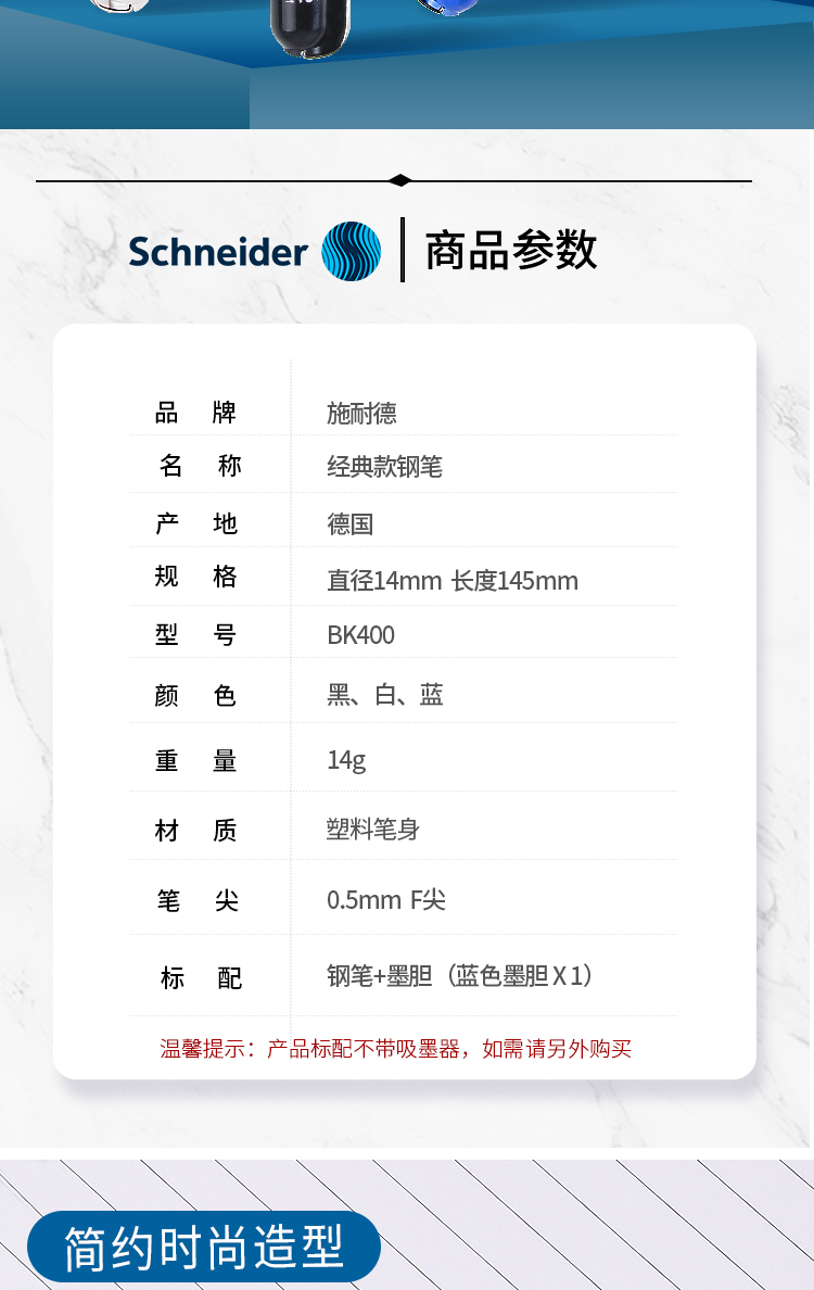 商品名称:施耐德(Schneider)钢笔德国进口经典款男女士学生用成人练字笔签字笔墨水笔F尖BK400黑色单支装