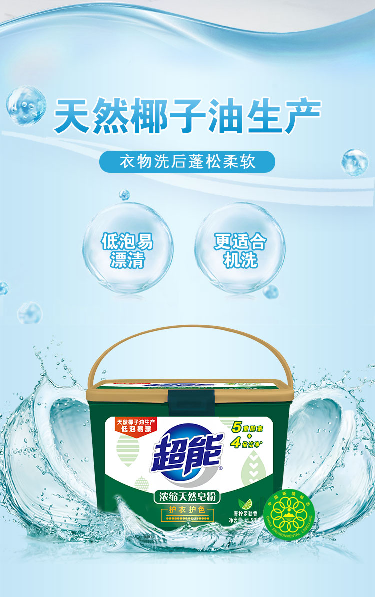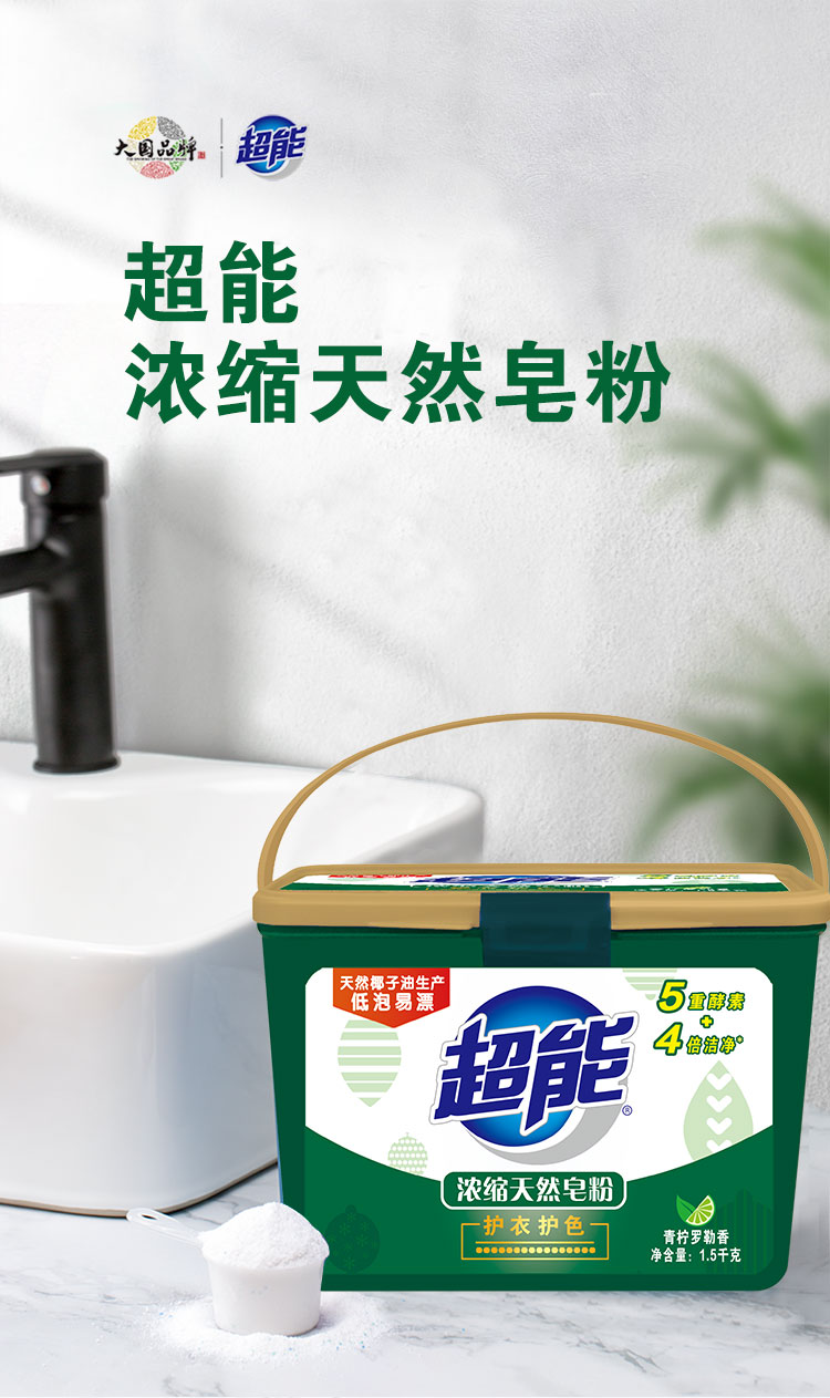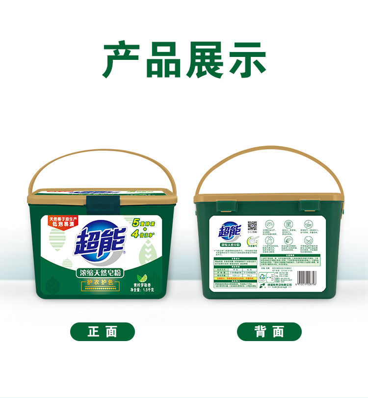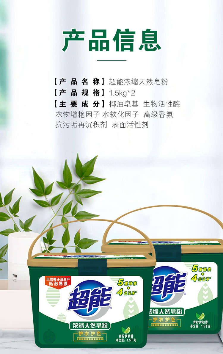 商品名称:超能 浓缩天然皂粉/洗衣粉1.5kg*2盒 4倍浓缩 青柠罗勒香型 低泡易漂 带勺 机洗 冷水高效