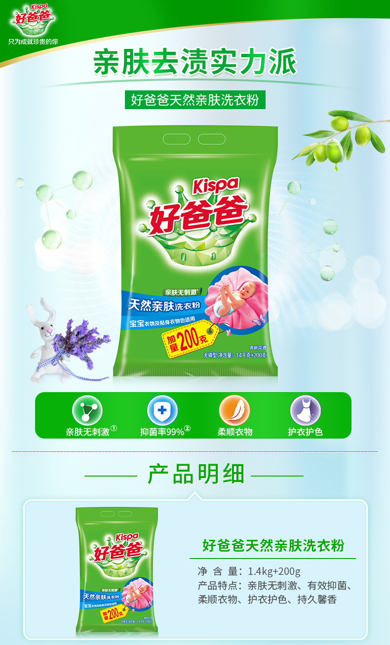 商品名称:好爸爸Kispa 亲肤洗衣粉亲肤无刺激实惠装 3.2kg