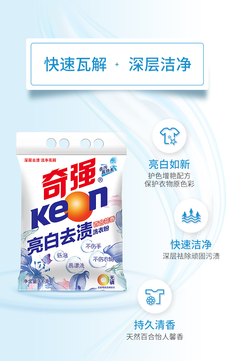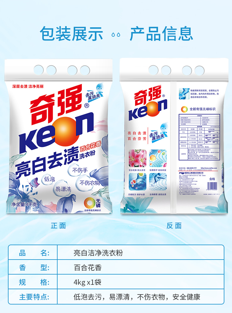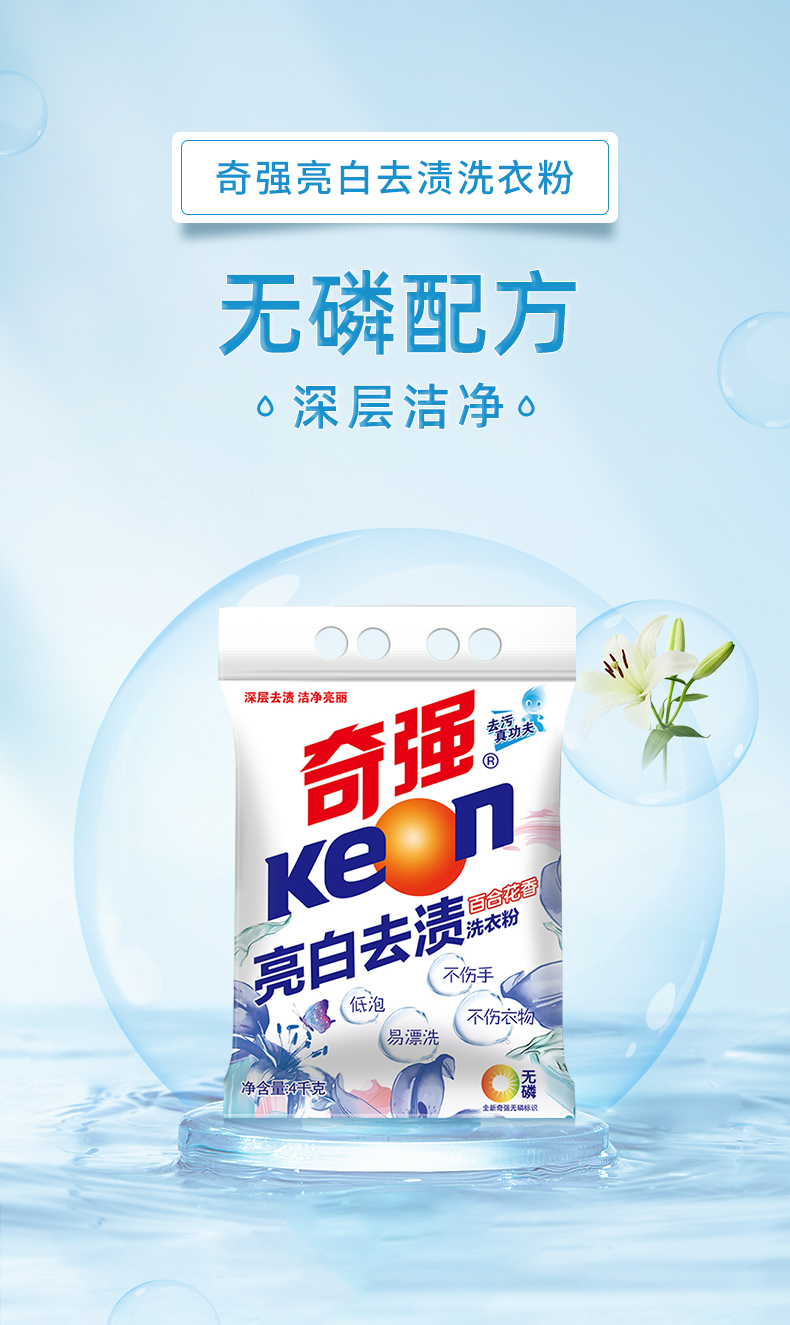 商品名称:奇强深层去渍洗衣粉 无磷低泡易漂不伤手护衣护色百合花香家庭装4kg
