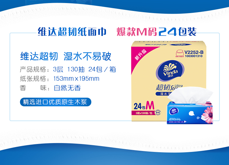 商品名称:维达(Vinda)抽纸 超韧3层130抽纸巾*24包(认准真M码) 整箱销售 可湿水面巾纸面巾纸
