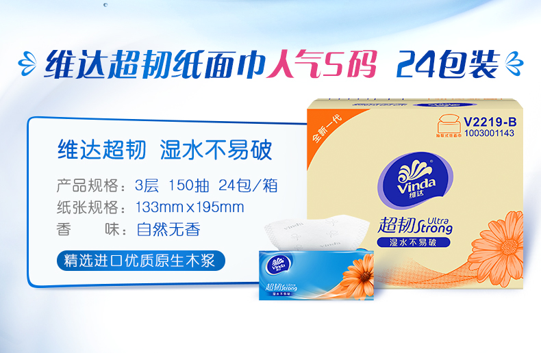 商品名称:维达(Vinda) 抽纸 超韧3层150抽软抽纸巾*24包(真S码) 整箱销售