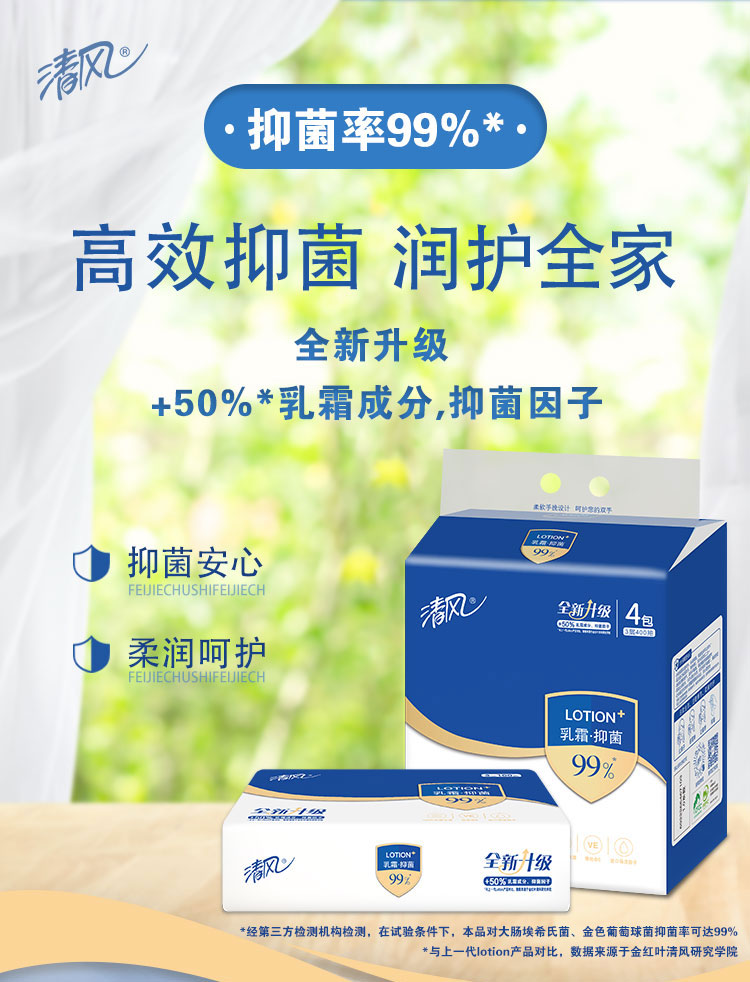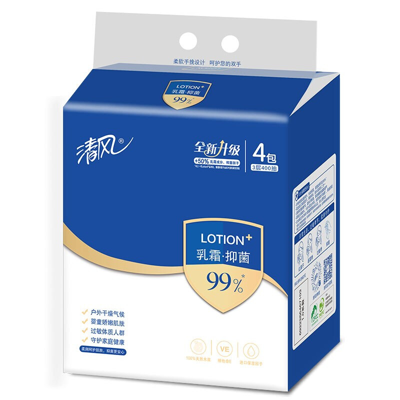 清风 (APP)抽纸 Lotion 保湿因子 抑菌纸3层100抽*12包( 干湿两用 敏感肌适用 乳霜纸)(整箱售卖)