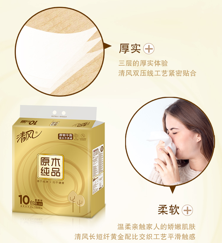 清风(APP)抽纸 原木纯品金装系列 3层120抽软抽纸巾*10包(母婴可用 柔软厚实)(新老包装交替发货)
