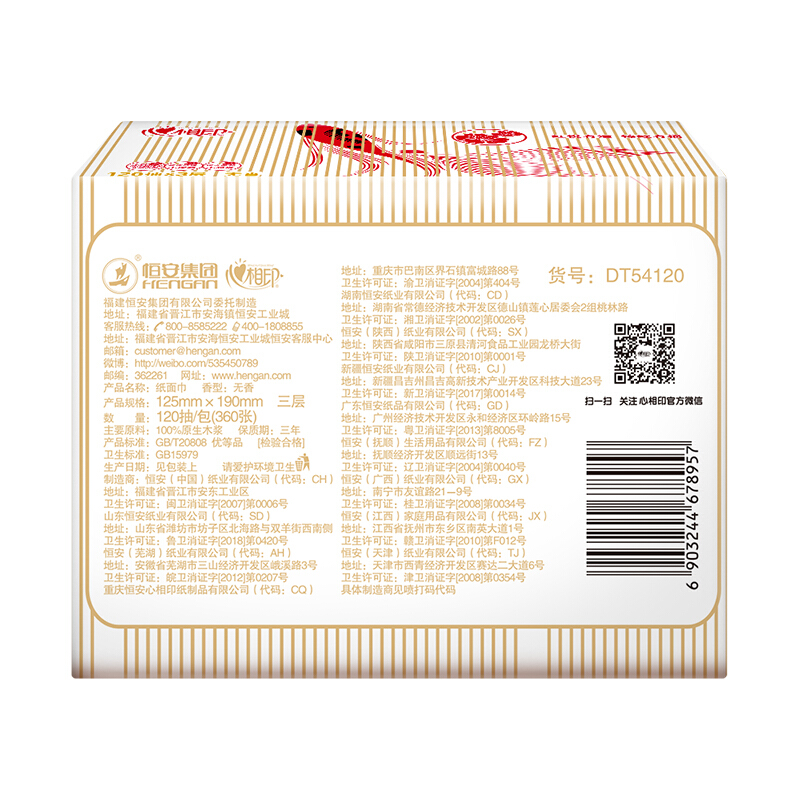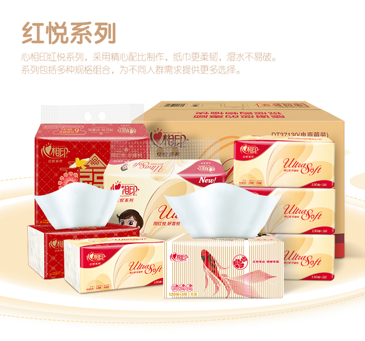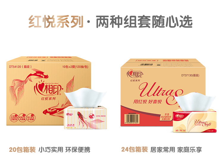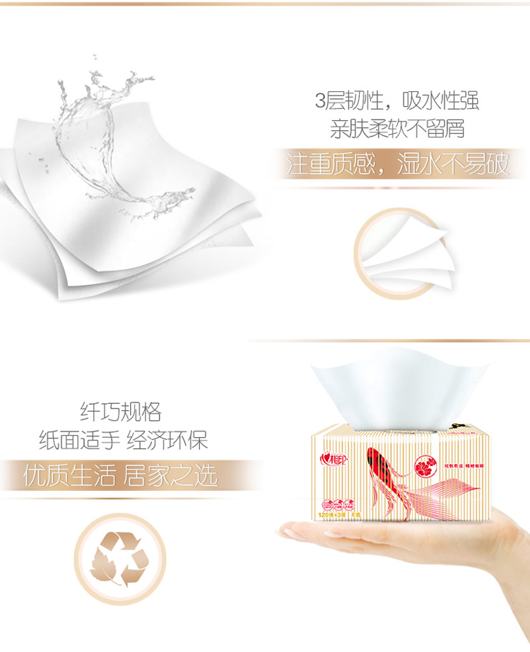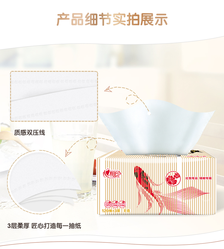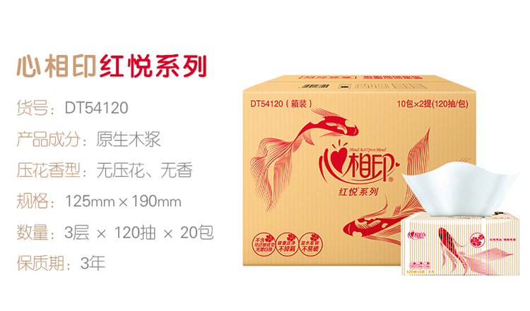 商品名称:心相印抽纸 红悦锦鲤系列3层120抽面巾纸*20包纸巾(小规格整箱销售)