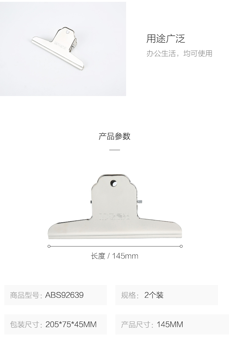 商品名称:晨光(M&G)文具145mm山形票夹 办公金属财务票据夹 不锈钢夹子画板夹 2个装ABS92639