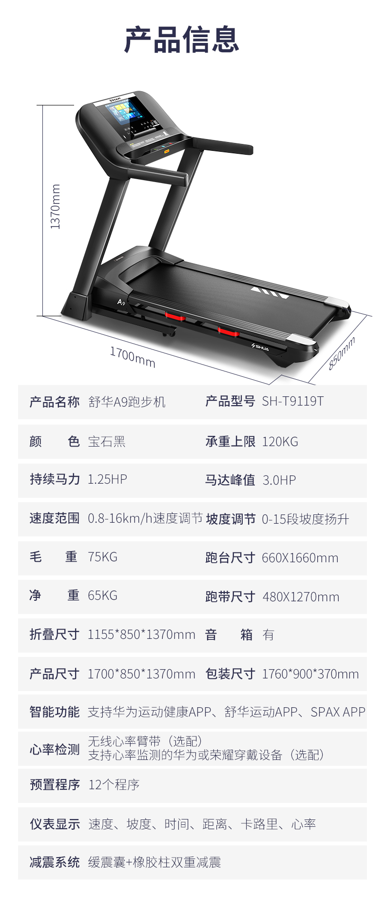 商品名称:舒华(SHUA)SH-T9119T 10.1英寸彩屏家用可折叠智能跑步机支持华为运动健康APP ZS