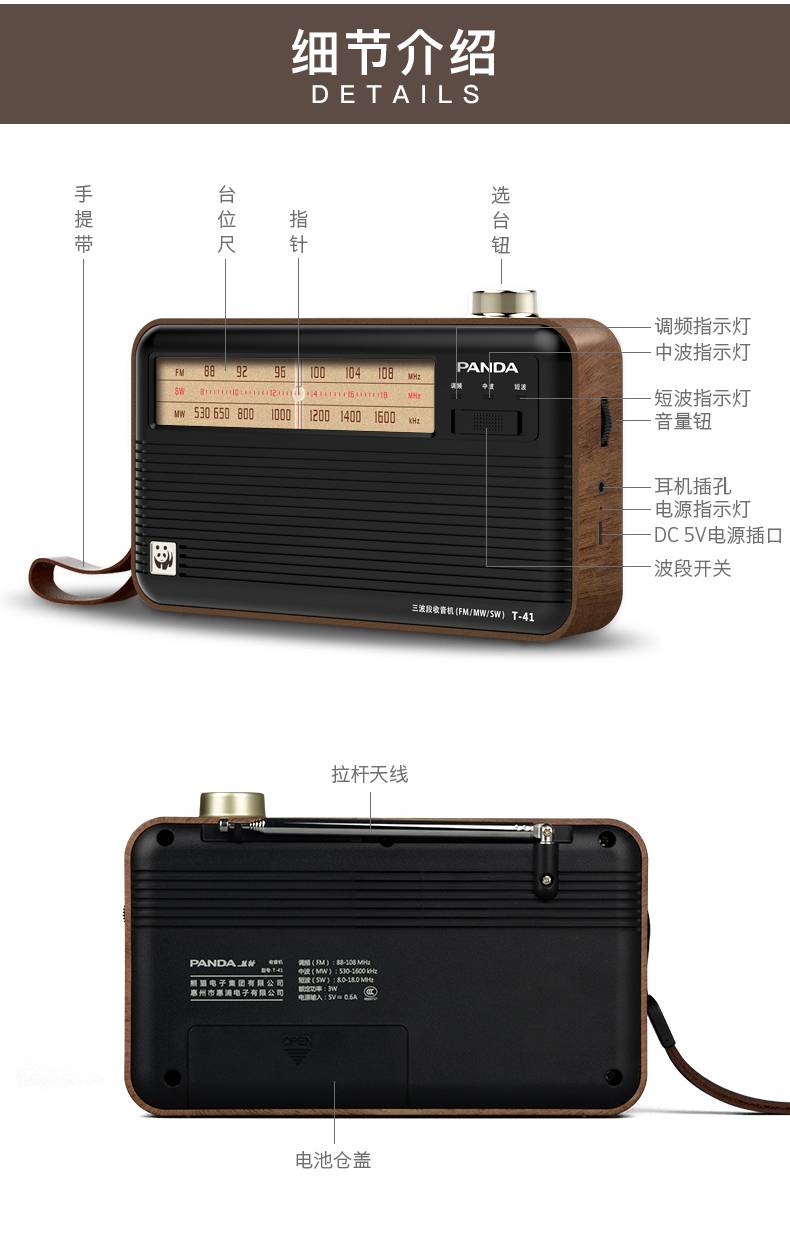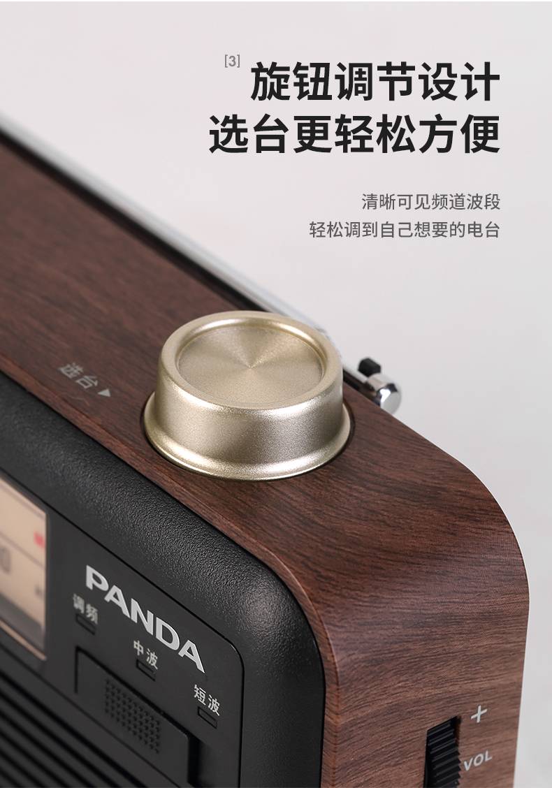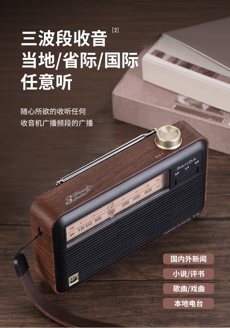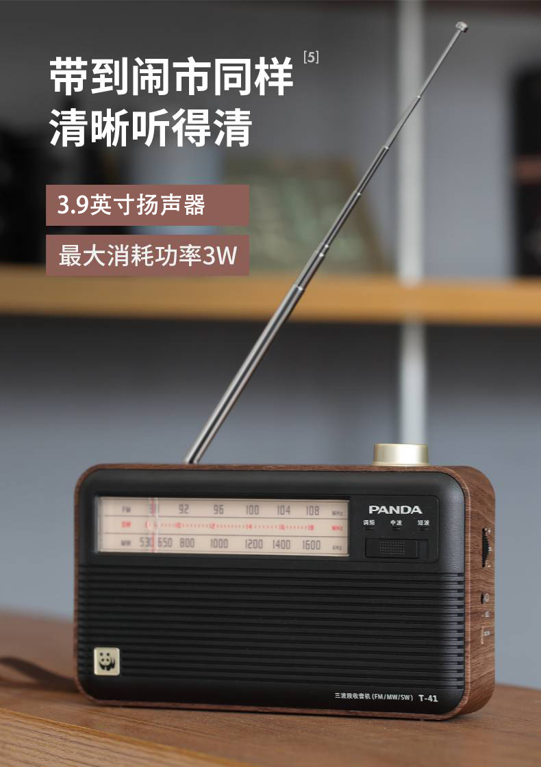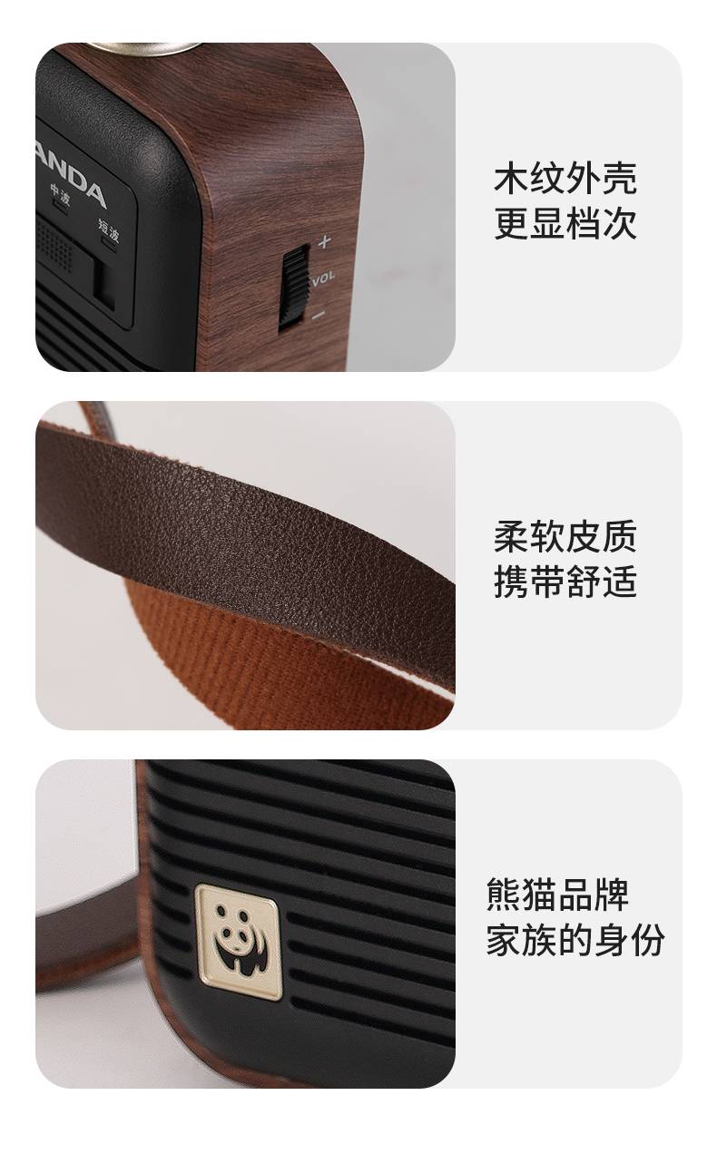 商品名称:熊猫(PANDA)T-41怀旧复古收音机锂电池三波段木纹老年人半导体