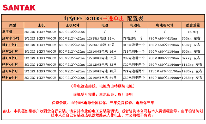 商品名称:山特(SANTAK)3C10KS 三进单出在线式UPS不间断电源外接电池长效机 10KVA/9000W停电续航6小时