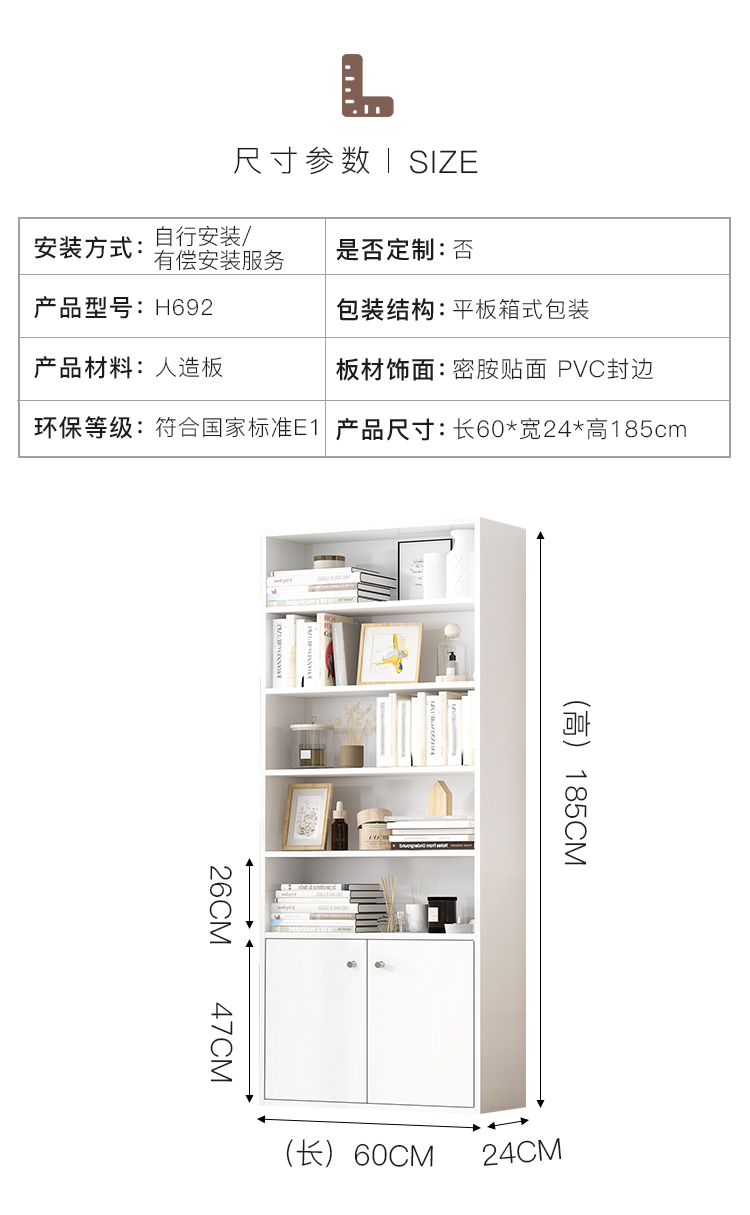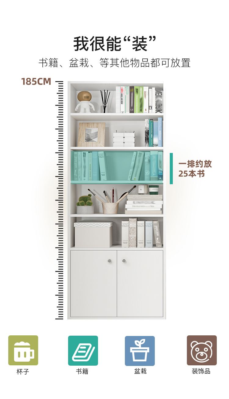 商品名称:家乐铭品 书柜书架 收纳架储物柜1.85M加固带门自由组合简易柜子省空间落地文件柜现代简约客厅置物柜 H692