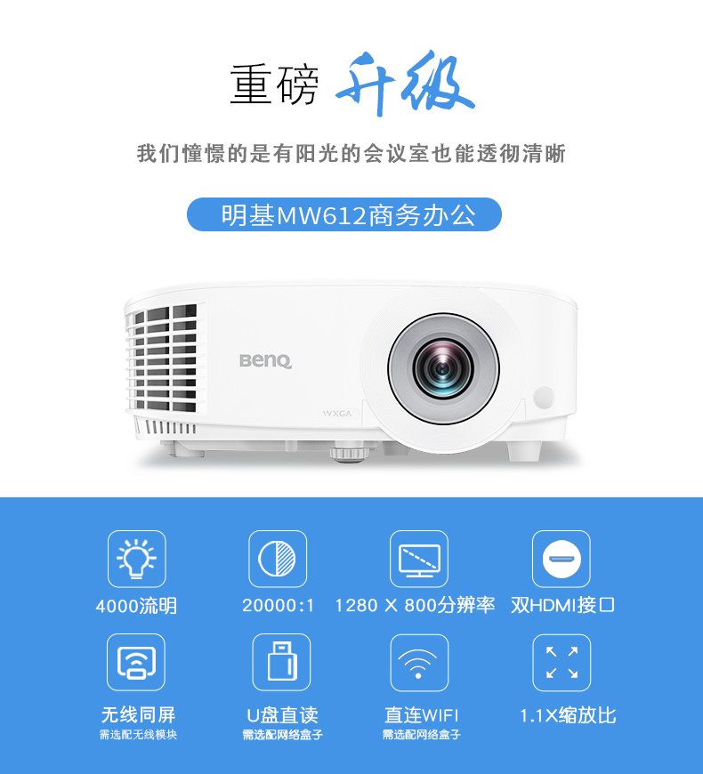 明基(BenQ)MW612 投影仪 投影机办公(高清宽屏 4000流明 HDMI*2 手机同屏)