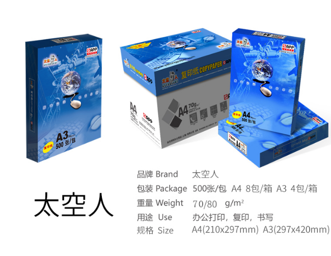 商品名称:金光/APP 太空人 复印纸 A4/70g/白色 500张/包 8包/箱