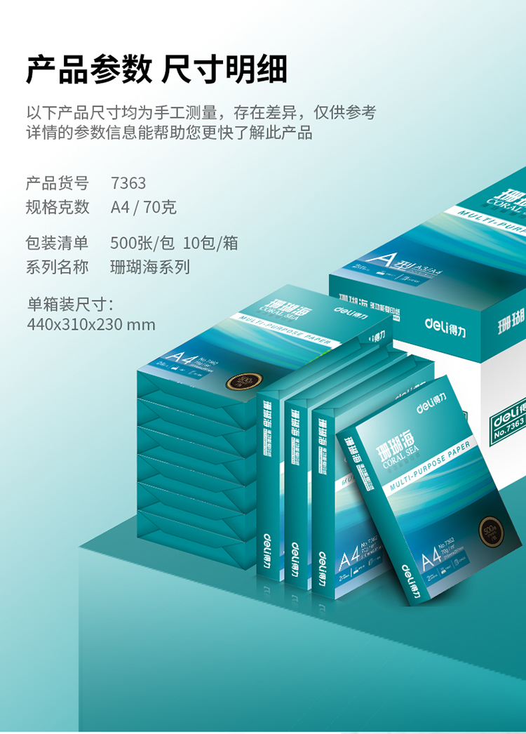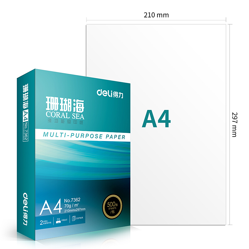商品名称:得力(deli)珊瑚海 70g A4 复印纸 中档款打印纸 500张/包 10包1箱(整箱5000张)