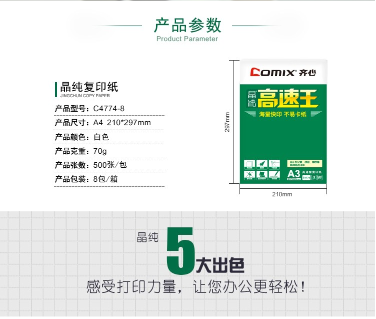 商品名称:齐心(COMIX)C4774 高速王复印纸A4 70g 高速不卡纸 单包装(500张)