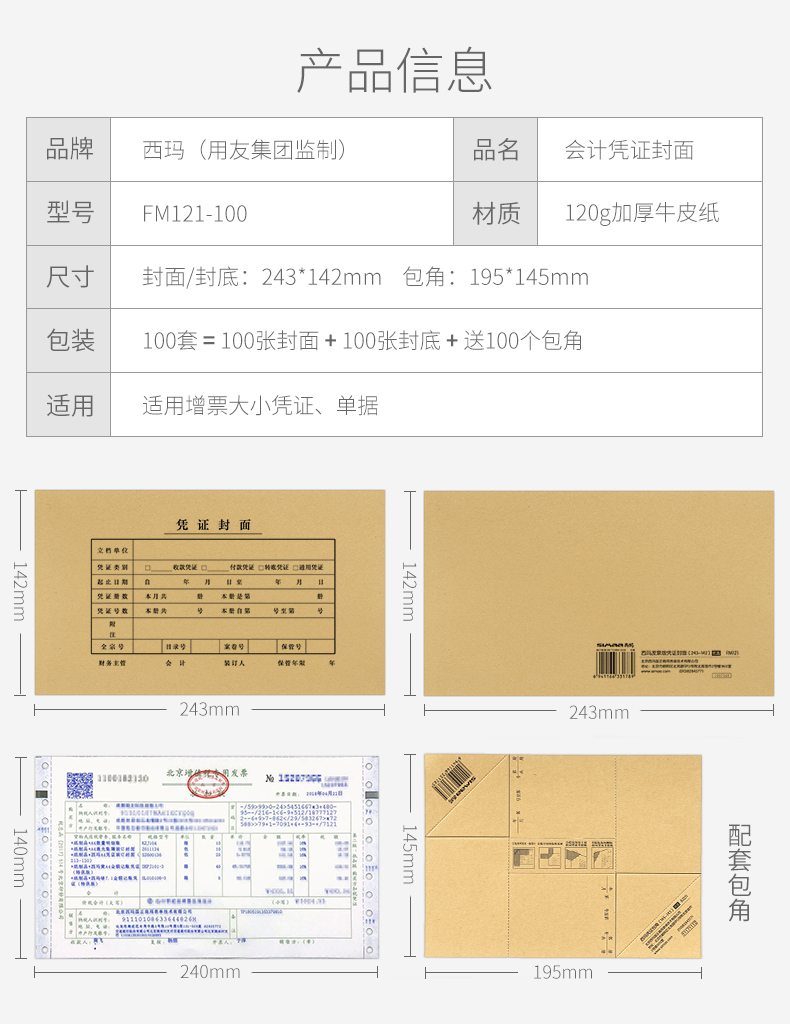 商品名称:西玛(SIMAA)发票版凭证封面包角装订包(封面100套+包角100个)243*142mm 240*140费用报销单记账凭证打印纸