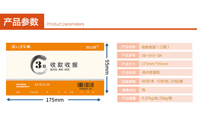商品名称:浩立信 百万位单栏三联收款收据 财务单据 175*95mm 10本/包×60页/本 带撕裂线无碳复写 10本装1本20份