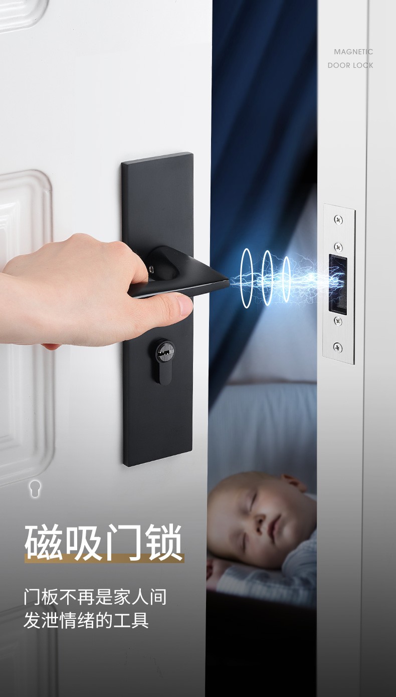 卡贝磁吸门锁室内卧室门锁黑色家用静音门锁实木门锁五金机械锁 磁吸门锁