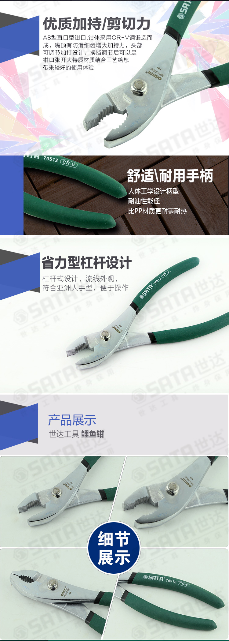 商品名称:世达(SATA)70512 多功能鲤鱼钳鱼嘴钳鱼尾钳活口钳子宽口钳8英寸