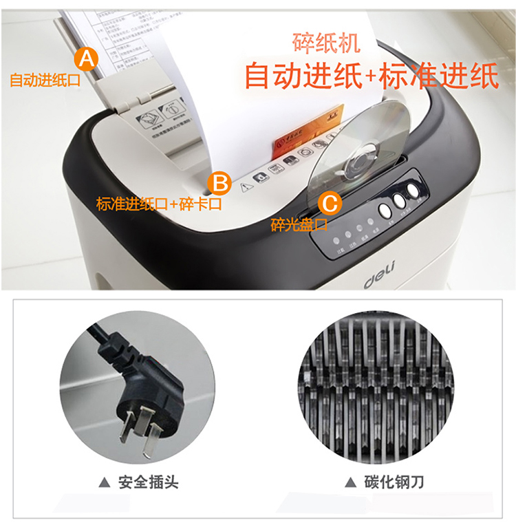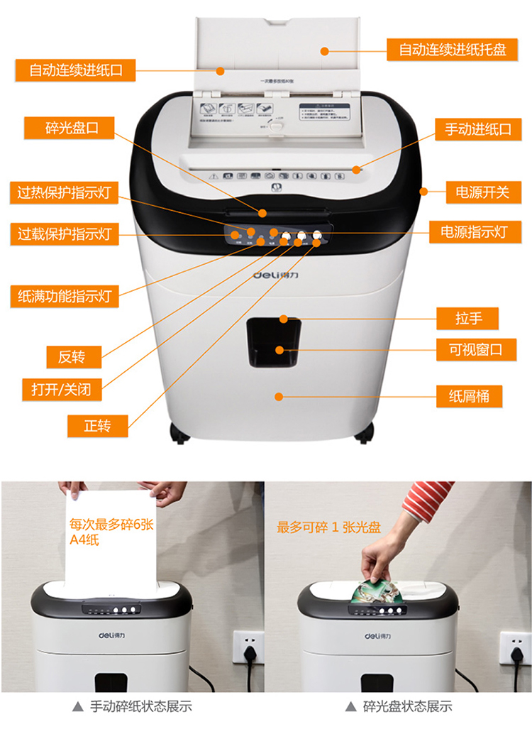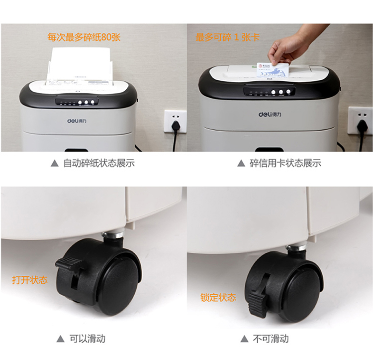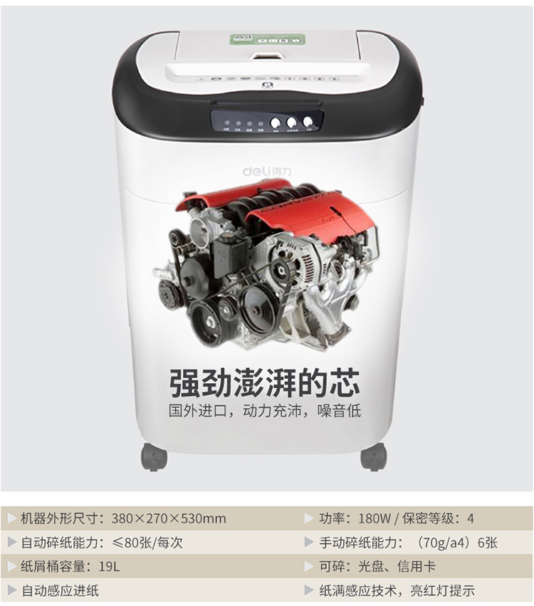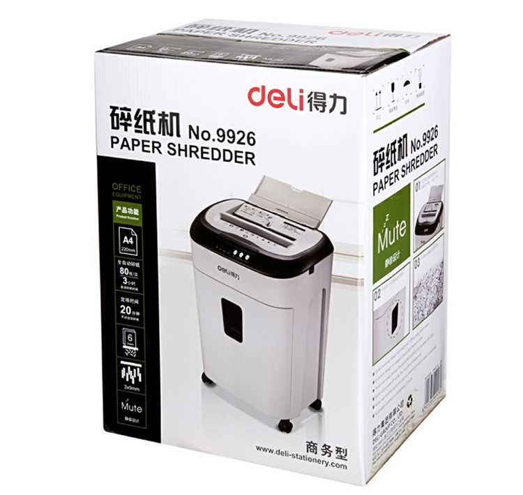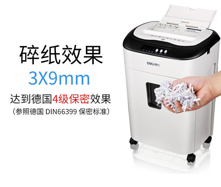 商品名称:得力9926 碎纸机 电动办公大功率粉碎机 自动进纸80张持续碎纸3小时 白色