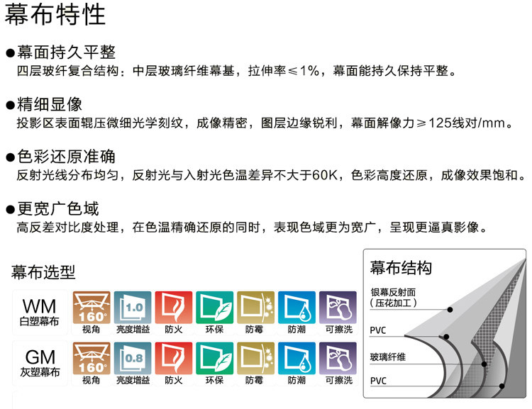 1、幕基为复合型玻纤材料,具有防火、防霉、防尘、不易变黄等优点,整幅幕面表面张力强,收缩率<1%,不易褶皱,抗老化,色彩还原性能优异等。