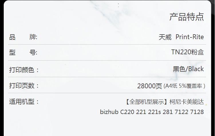 商品名称:天威 KONICA MINOLTA-TN220-540G-黑色复粉粉盒 经典装 适用于柯尼卡美能达C221/C221S/C281/C7122/C7128